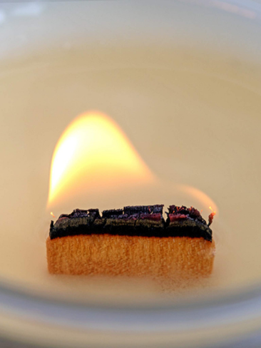 Ceară naturală din soia (fără parafină), cu fitil din lemn natural care trosnește delicat atunci când este aprins.